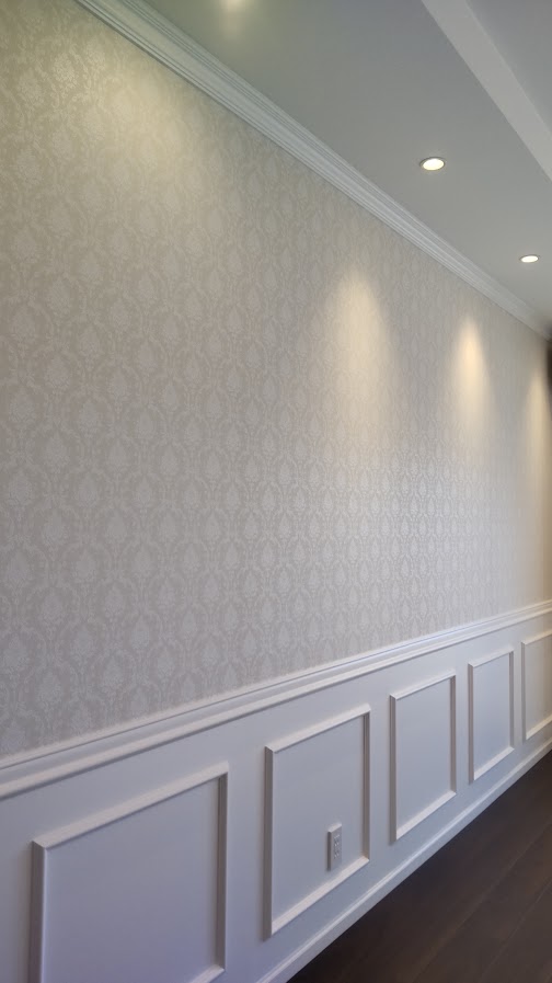 サンメント(モールディング)を天井の廻り縁や腰壁に使ったリビングをデザインしたのですが、部屋の4面それぞれ窓やドアがあるので腰壁の四角い飾りモールディングの寸法にとても悩んだ事例です。