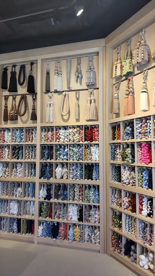 たくさんのトリム(カーテンにつけたりします)やタッセル(カーテンを束ねます)のショールーム。色とりどりで眺めているだけでも幸せでした。